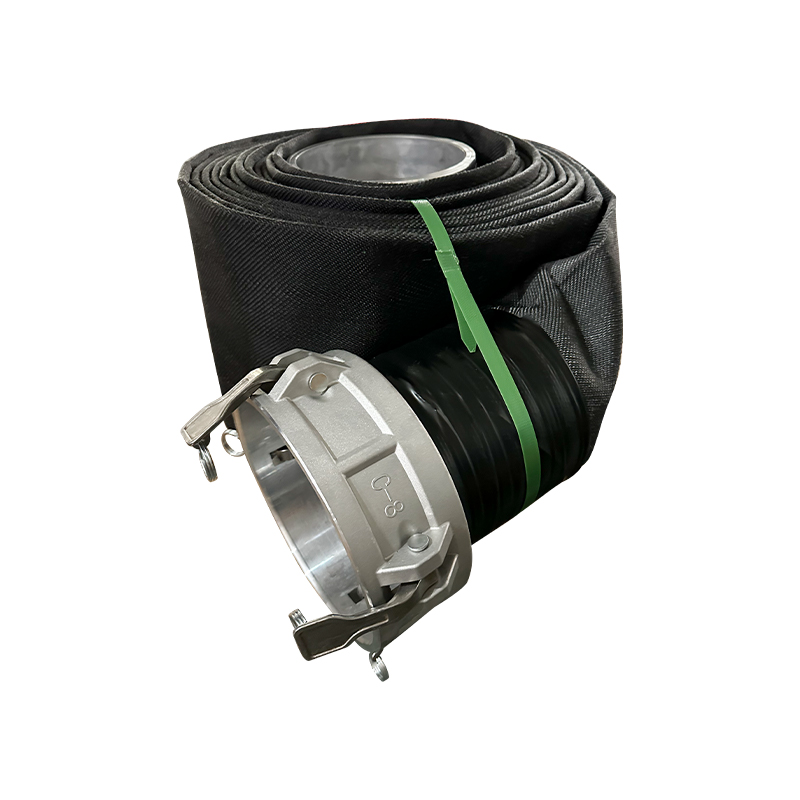 Mangueira plana de mineração de 8 polegadas com conectores Storz, mangueira plana resistente para drenagem de alta pressão em mineração. Apresenta acoplamentos Storz de conexão rápida e armazenamento compacto.